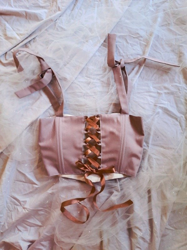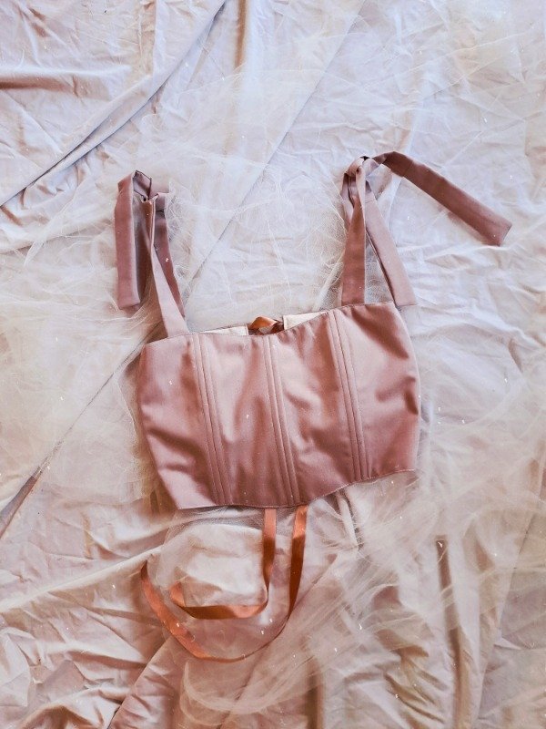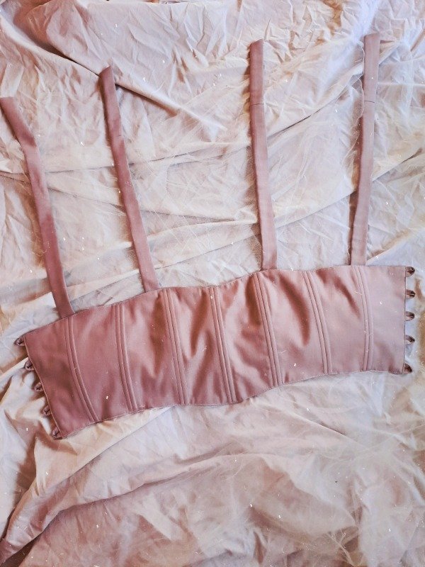 Material gabardina liviana, tiene dos ballenas en cada recorte a lo largo del corset, incluye la cinta de raso